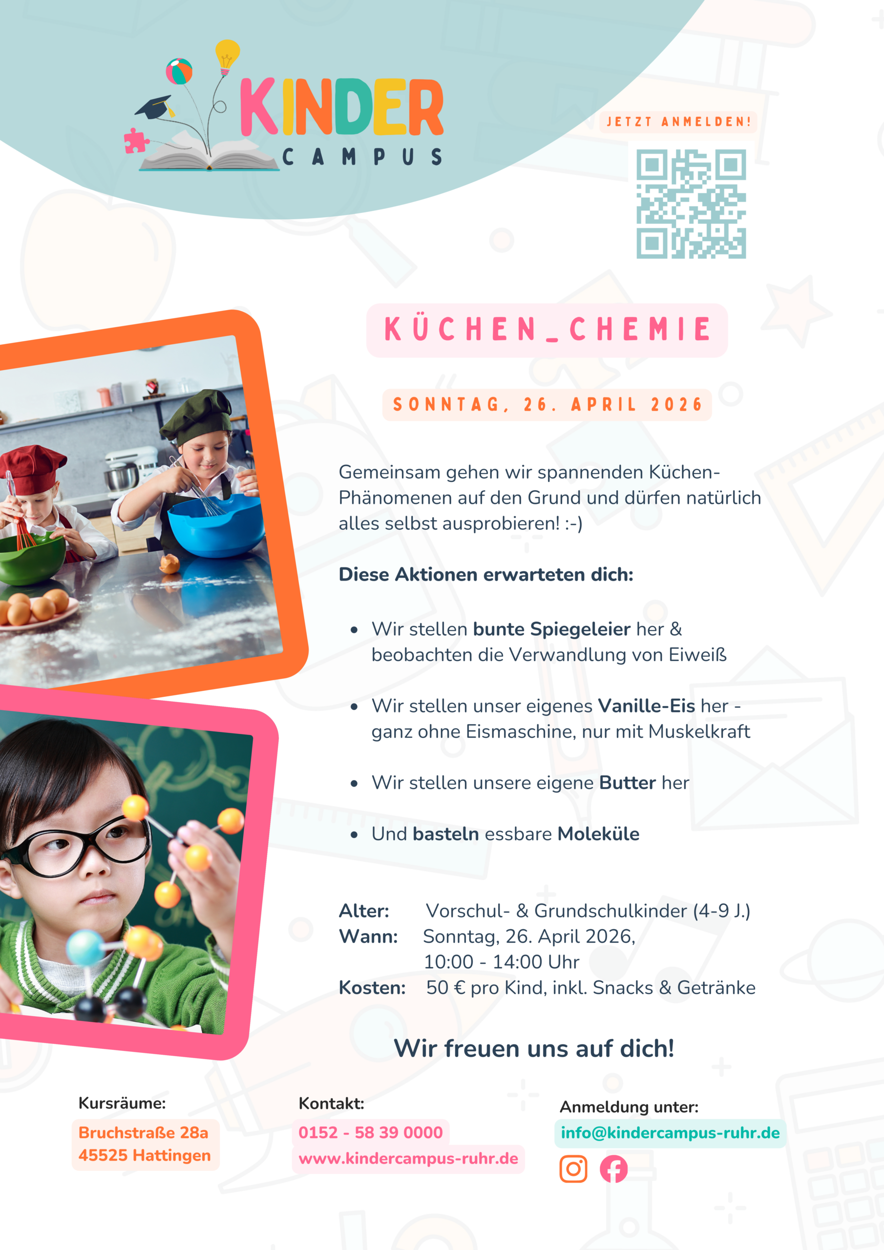 Am KinderCampus bieten wir an vereinzelten Wochenenden spannende und abwechslungsreiche Bildungskurse für kleine Macher und kreative Köpfe. Unser breites Themenspektrum bietet Vorschul- und Grundschulkinder eine fundierte Lern- und Spielplattform, die sich der fünf Bildungsbereiche Mathematik, Naturwissenschaft, Informatik & Technik, Gesundheit, Ernährung & Bewegung, Natur & Umwelt, Kreativität & Musik und Sprache, Literatur & Medien bedienen. Unsere Kurse bieten außerdem praxisorientierte Anregungen und werden alltagsnah und interdisziplinär vermittelt.